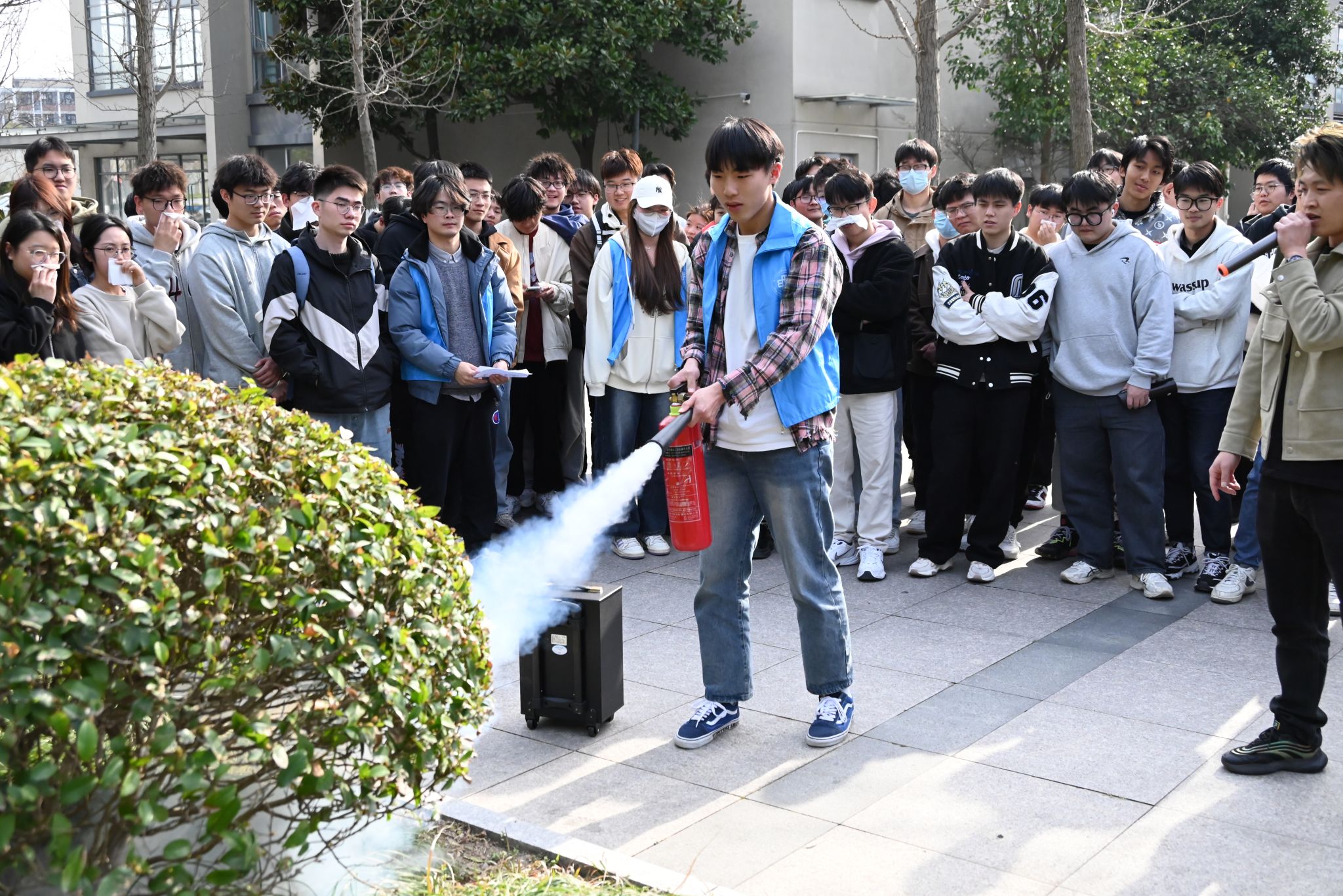 疏散逃生环节结束后,保卫处丁伟老师现场讲解了各类火灾事故发生的原因和经验教训,并详细讲授各类灭火器材使用方法,有效提高了师生们“一懂三会”能力。