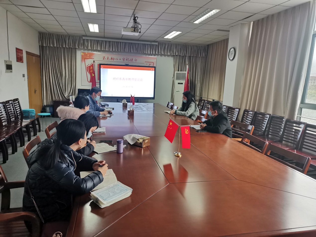 3月21日下午,纺织工程系在崇礼楼419会议室召开青年教师座谈会。座谈会由纺织工程系主任沈加加老师主持,纺织工程教工党支部书记韩万里和2021年入职纺织工程系的青年教师参会。