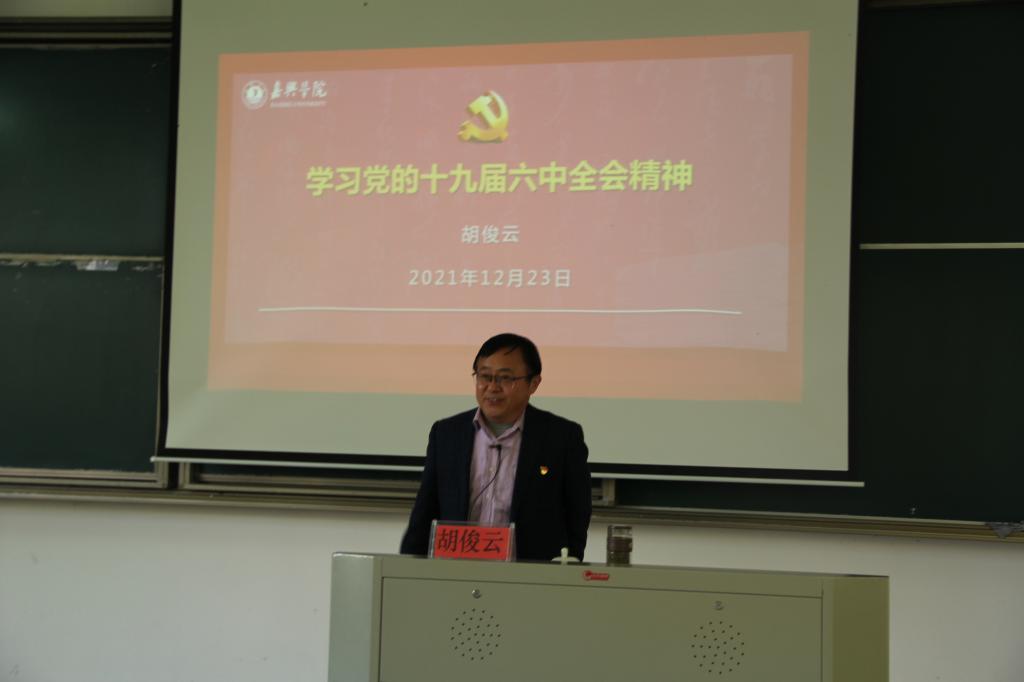 胡俊云从“深入领会党的十九届六中全会的重大意义、深刻认识党的十九届六中全会精神丰富内涵、从党的百年奋斗历程中充分汲取智慧和力量”三个方面,系统全面解读了十九届六中全会的政治意义、历史意义和战略意义;阐释了十九届六中全会的“一个主题”、“两个确立”、“三次历史性飞跃”、“四个伟大成就”、“五个方面历史意义”和“十个坚持”的丰富内涵;他对标对表省委“六讲六做”活动要求,指出要强化党的领导,加快一流应用型综合性大学建设步伐;要强化立德树人、培养堪当民族复兴大任的时代新人;强化育引并举,打造一流有效的团队队伍;要强化平台建设,加强理论研究阐释和科技创新;要强化应用型建设,提升服务嘉兴贡献度的要求。