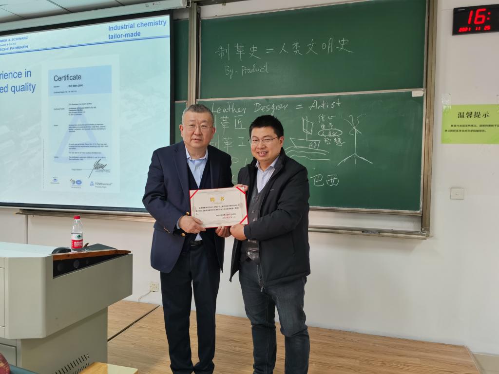 首先,罗建勋主任致辞,代表公司、轻化工程系对张建华总经理一行表示热烈欢迎,对过去两年期间公司对轻化工程专业教育事业的支持表示感谢。随后,张总就皮革产业发展历程、历史渊源、制革生产过程、皮革类型与发展现状、专业发展前景、德国司马化工公司的相关情况等为师生们做了精彩的报告,报告过程中与员工进行了深入的互动交流。最后,罗建勋代表轻化工程系为张总颁发聘任其为客座教授的证书。