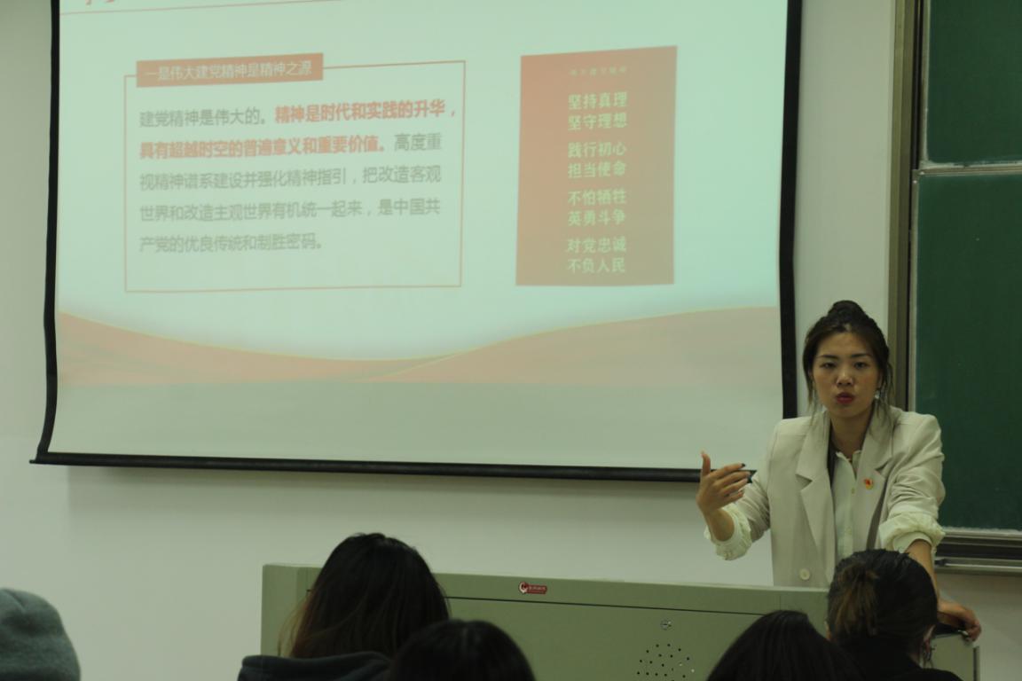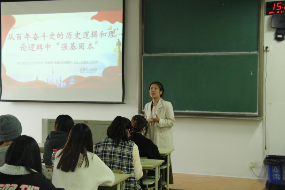 宣讲会上,刘佳仪做了“从百年奋斗史的历史逻辑和理论逻辑中‘强基固本’-学习习近平总书记在庆祝“中国共产党成立100周年‘大会上的重要讲话精神’” ”主题报告,并从个人学习领悟、心得体会、践行誓言三方面做了系统阐述。她告诉党员,青春由磨砺而出彩,人生因奋斗而升华。并对同学提出三点希望:希望同学们要坚定理想信念,践行初心使命;要夯实专业基础,练就过硬本领;要厚植家国情怀,投身建国伟业。