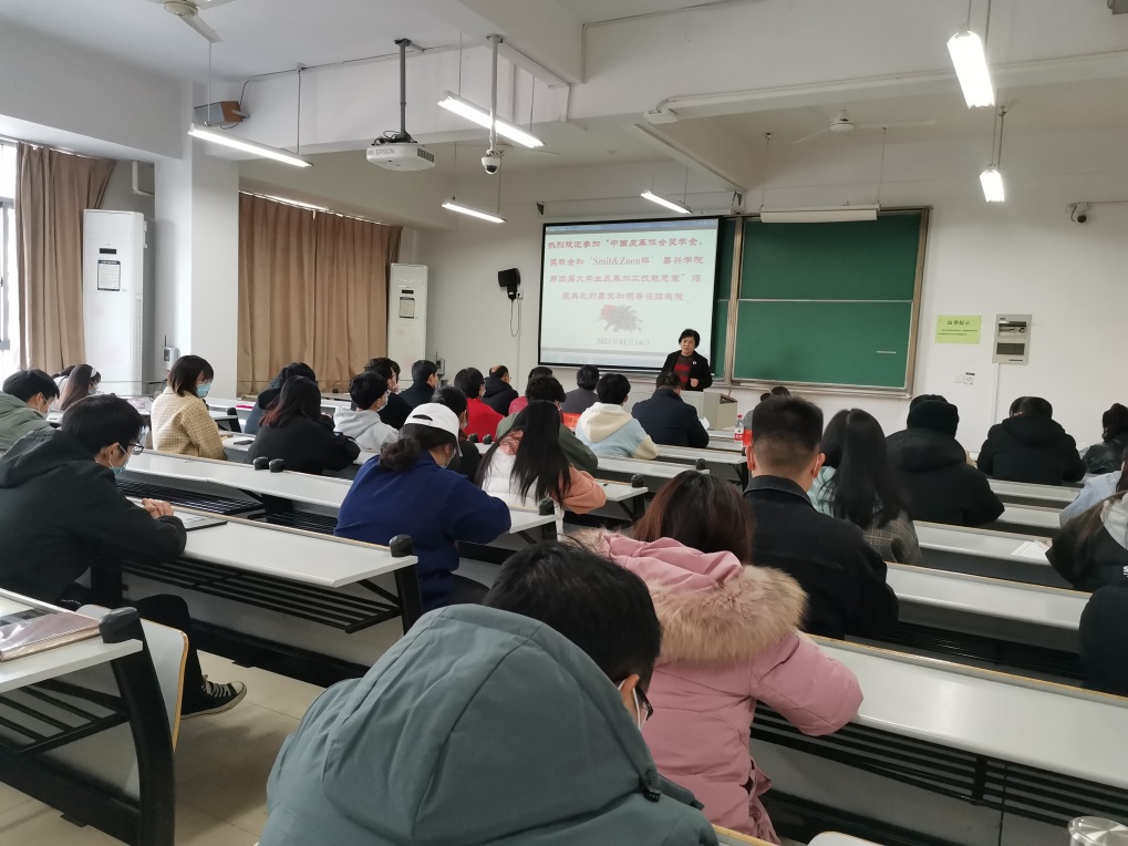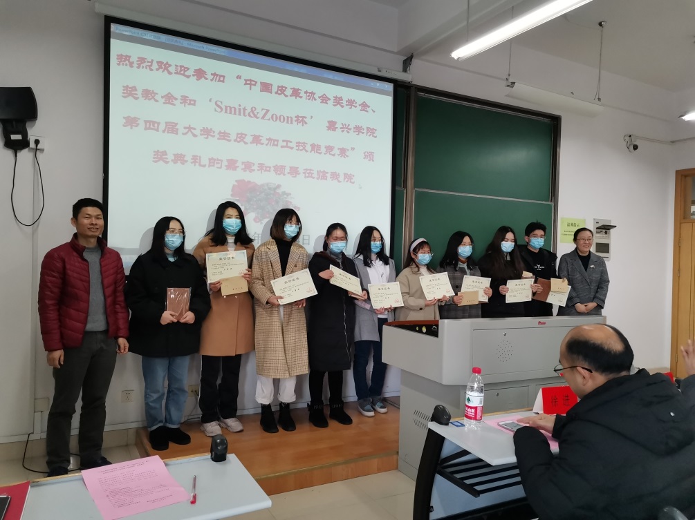 1月14日,公司在14号楼316教室隆重举行 “中国皮革协会奖学金、奖教金”和“‘Smit & Zoon杯’嘉兴公司第四届老员工皮革加工技能竞赛”颁奖典礼。中国皮革协会副理事长、浙江省皮革行业协会理事长李伟娟女士、浙江省皮革行业协会秘书长官敏健女士、浙江省皮革行业协会常务副秘书长谢基尔先生、荷兰Smit & Zoon公司涂饰部中国区总经理徐建平先生、社会合作处副处长徐进、公司党委书记、经理易洪雷教授、副经理李海东教授、轻化工程系主任罗建勋副教授及轻化工程系全体教师和获奖员工代表参加了本次颁奖典礼,典礼由公司副书记黄芳芳老师主持。