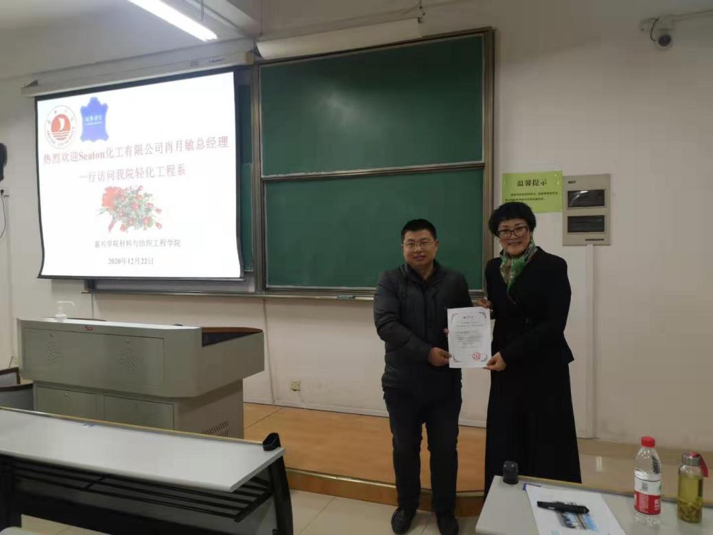 报告结束后,罗建勋老师代表专业向肖月敏总经理发放了“嘉兴公司皮革讲堂”的荣誉证书,以感谢肖总对公司轻化工程专业教育的支持。