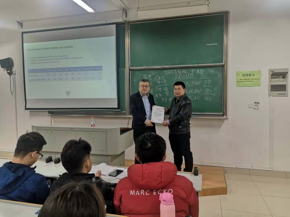 报告结束后,罗建勋老师代表专业向张建华先生发放了“嘉兴公司皮革讲堂”的荣誉证书,以感谢张先生对轻化工程专业办学的支持。