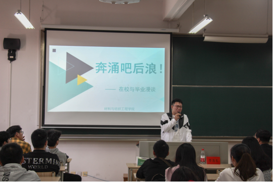 10月17日下午13:00,公司三位优秀员工向纺织系全体师生做了汇报和分享。浙江华峰氨纶集团区域经理孙剑峰、浙江新澳纺织股份有限公司染色部负责人胡李坚、东华大学在读博士孟娜分享了自己在校期间的学习经历,以及毕业后在行业内的成功经验。黄立新副经理做总结讲话,坚定了大家热爱专业,扎根行业的决心。