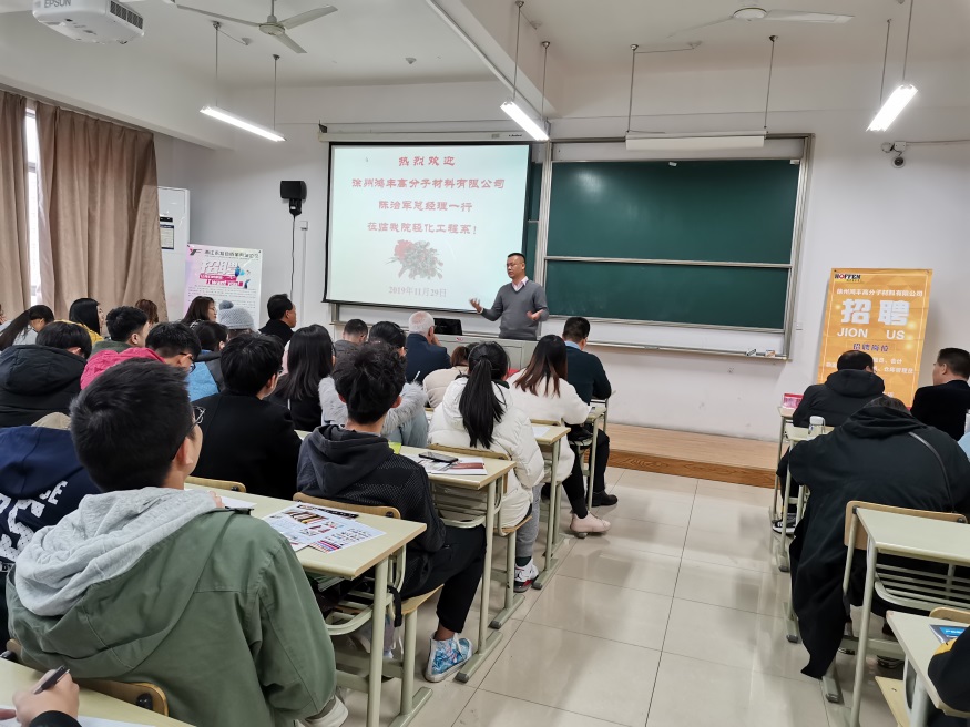 应公司轻化工程系的邀请,徐州鸿丰高分子材料有限公司陈治军总经理一行于11月29日访问公司轻化工程系,随行有李林高工、陈祖武经理、Jesus先生、LUCA先生、陈小亮主任,以及浙江永发合成革有限公司王新才总经理一行。轻化工程系全体老师、轻化(实验)161、轻化(实验)191班全体同学参加了本次活动。该活动由轻化工程系主任罗建勋主持。