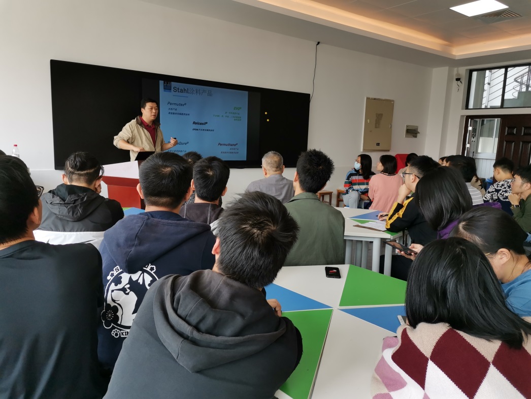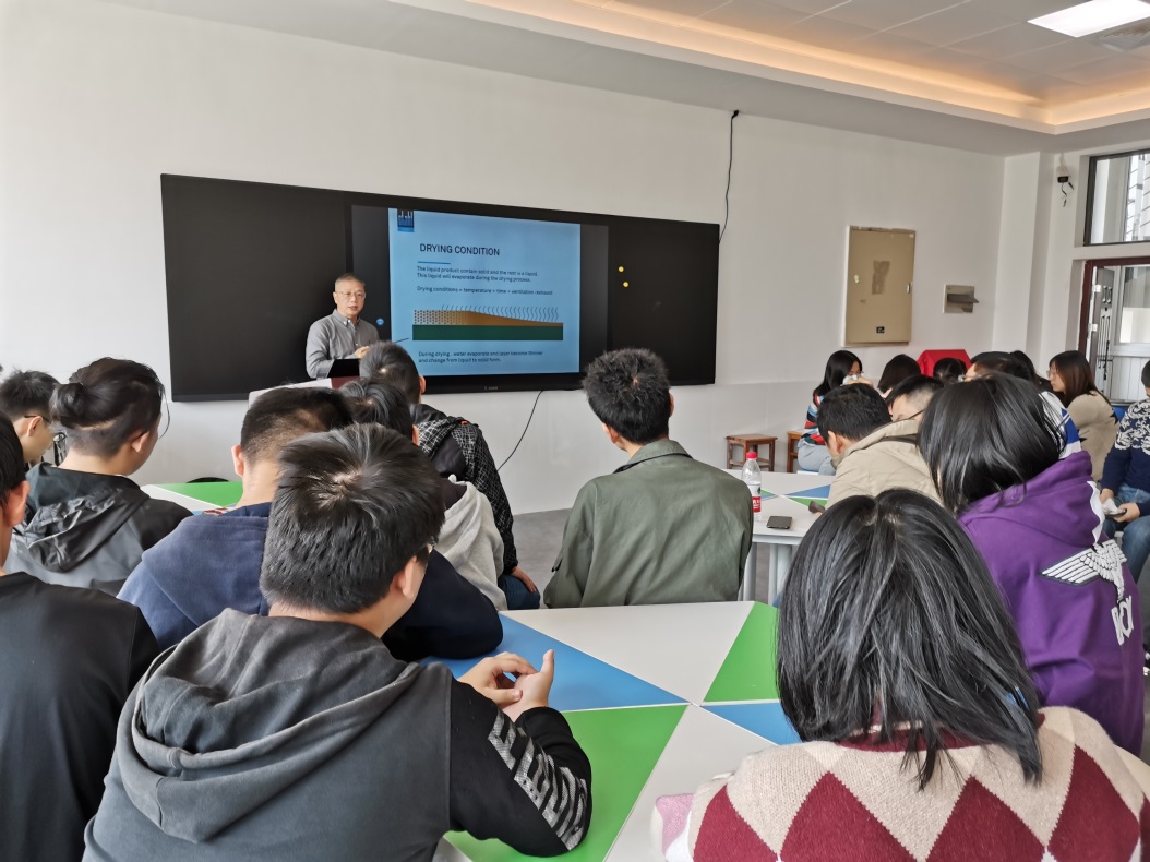 首先,郭祥经理做了“Performance coating高性能涂料”的报告,简单介绍了公司合成革部门的基本情况、高性能&环保型涂料及其在合成革上的应用。随后,夏敏经理做了“TRANSFER COATING”的主题报告,就合成革的工艺技术给师生们进行了讲解,同时与师生进行了互动交流。在报告后,夏经理、郭经理指导员工们合成革的干法和表面处理等实验。公司易洪雷经理亲切会见了两位嘉宾并就进一步的合作进行了洽谈。
