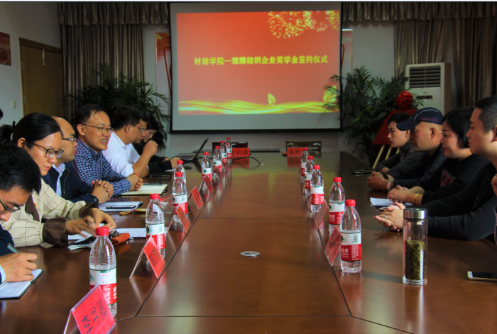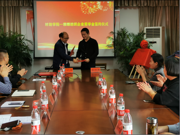 10月18日下午,在闻道楼419会议室举行2019年产学合作签约仪式。浙江雅娜纺织有限公司副总经理吴士奇一行2人,山东金贝尔贸易有限公司总经理周秀一行3人,嘉兴公司社会合作处副处长徐进,公司党政班子、教学系主任、教师代表参加了签约仪式。公司党委副书记黄芳芳主持签约。