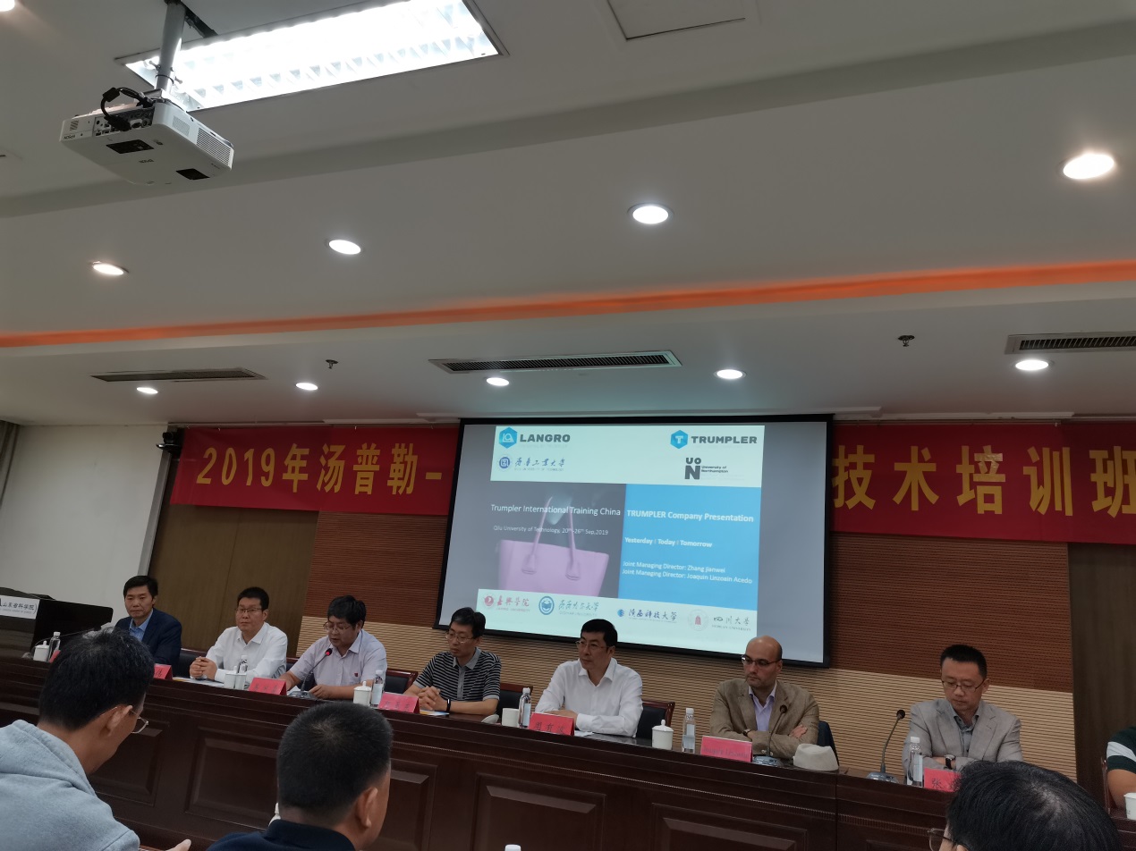 9月20-21日,公司经理易洪雷教授和轻化工程系主任罗建勋副教授带领轻化2016级TRUMPLER皮革实验班员工代表赖纪浩、冸林丹、金琳朝、杜曼宜等访问齐鲁工业大学轻工科学与工程公司并参加 “TRUMPLER-齐鲁工业大学制革技术培训班开班典礼”。参加本次培训班的还有来自四川大学、陕西科技大学、齐齐哈尔大学等院校的轻化工程专业皮革方向的师生代表。开班典礼由齐鲁工业大学轻工科学与工程公司褚夫强经理主持。