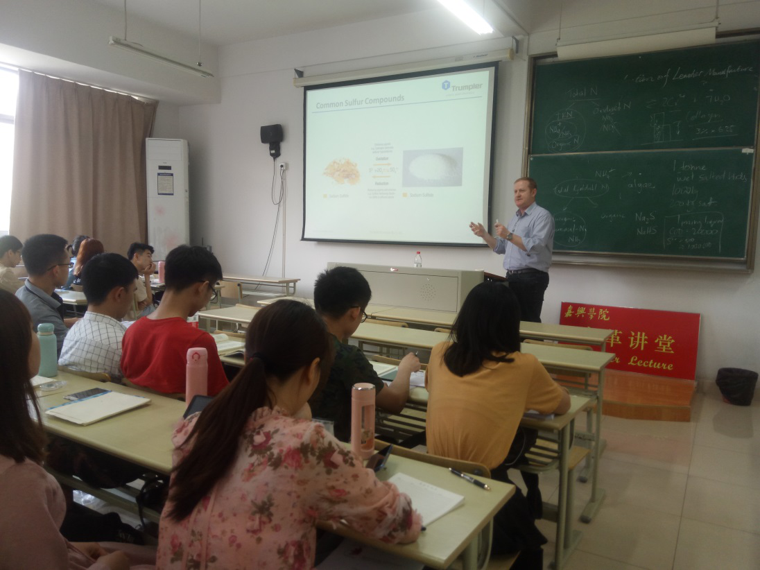 为了进一步加强公司轻化工程专业的内涵建设和国际化交流,应公司轻化工程系的邀请,德国TRUMPLER公司技术专家、轻化工程专业客座教授Dr Jeffry和公司技术经理、公司员工陈正栓先生于5月18日莅临公司并做客“皮革讲堂”,为TRUMPLER皮革实验班员工讲授《Cleaner production of leather manufacture》课程,内容包括“Leather Overview”、“Leather Manufacture & Pollution Overview”、“Pollutants in Leather Manufacture”、“Cleaner Technologies”等。