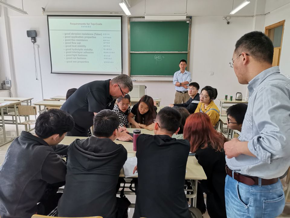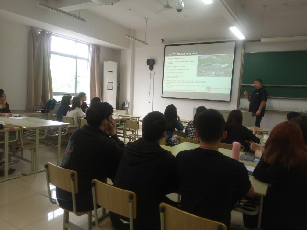 应公司轻化工程系的邀请,美国QUAKER COLOR公司的技术工程师James Withelder先生和杨欣先生于5月14日做客“嘉兴公司皮革讲堂”,为轻化工程专业员工做了“Basic Finishing Knowledge”及“皮革制造4.0”的学术报告,并进行了深入地交流。该报告围绕当前皮革的发展趋势、皮革涂饰的关键技术及皮革智能制造实现的条件等内容进行了精彩的讲解,开阔了本专业师生的视野,加深了对专业知识的理解。