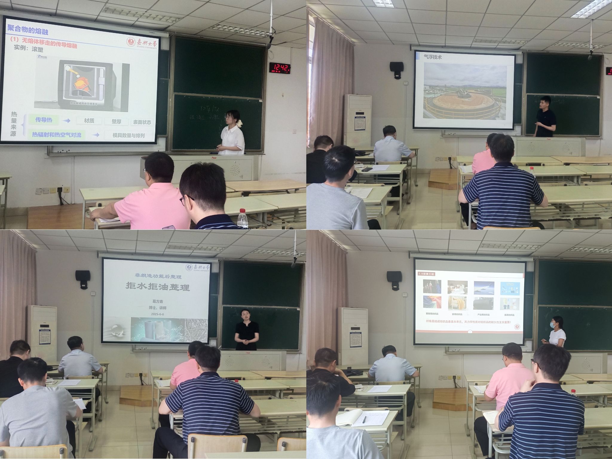2025年6月6日中午,公司在崇礼楼506教室进行了青年教师助讲培养试讲考核。试讲考核专家小组由公司督导、系部教师代表等五位专家组成。2024年新入职教师葛方青、张天蒙、柯亚楠、易玉丹分别针对《非织造功能后整理——拒水拒油整理》《废水处理技术》《纺织材料学——纤维的拉伸力学性能》《聚合物的熔融》四个课程主题进行了说课和章节试讲。