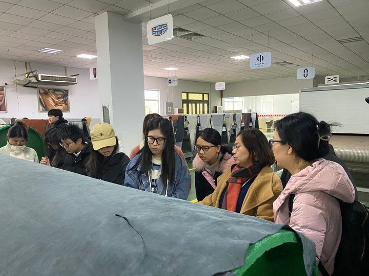 在明新旭腾新材料股份有限公司,人事部陈蕾经理向大家介绍公司情况并和相关负责人带领师生们参观了涂饰车间、裁片车间、检测中心和研发中心,详细介绍了革坯性质、工艺流程、生产设备及检测方法等。在浙江富卡科技有限公司,负责人介绍并引导师生参观了皮革生产中的整饰工段、质量检测、研发中心、汽车坐垫革裁片、打孔等。在浙江格莱美服装有限公司,员工体验了以时尚皮革服装为代表的皮革制品的生产过程及成品。