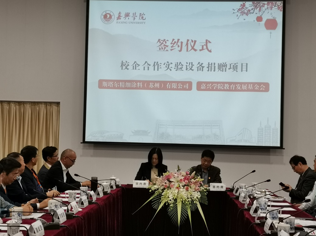 首先,轻化工程系主任罗建勋老师致欢迎词,感谢STAHL公司多年来轻化工程专业教育事业的大力支持,同时,介绍了近年来专业的发展情况。其次,王高工给师生们简要介绍了公司的情况及对同学们的希望。最后,罗建勋老师和王高工分别代表双方在设备捐赠协议、奖学金续签协议上签字,并宣布开启STAHL皮革水场技术交流周。