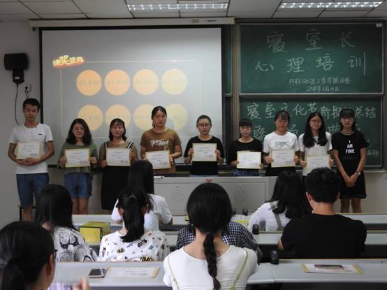 614日中午12:30,材纺公司于闻道楼502教室举行寝室长心理培训暨2017-2018学年寝室文化节颁奖典礼,获奖寝室及2017级所有寝室长参与其中。