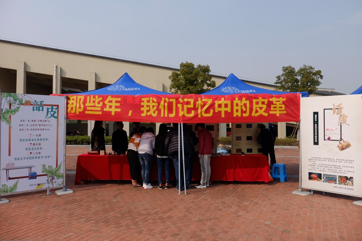 下午13:00,志愿者们返回校园,于梁林青春广场开展“那些年,我们记忆中的皮革”主题活动,围绕皮革面料鉴别、皮件清洁、护理以及制作等“皮革要事”展开志愿服务。过往的同学和老师们纷纷被别出心裁的宣传版面吸引,驻足向志愿者们咨询学习。志愿者们运用专业所学,耐心、细心、贴心地向师生讲述关于皮革的生活小常识,加强大家对于材料类专业的认识和了解。
