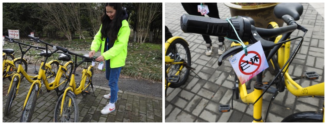 3月8日下午13:30,志愿者们组成五只小分队,在不影响同学们正常用车的情况下,对教学楼以及校门口等共享单车较为密集的区域进行了车辆整理和报修工作。遵循着“不漏过一辆坏车”这个原则,志愿者们利用手机共享单车APP,逐一排查所有车辆,通过扫一扫,骑一骑,筛选出损坏单车,并在网络报修后,在车辆显眼处悬挂“已坏”标志,同时将有隐患的单车集中单独摆放,以便同学们辨别与使用。在志愿者们的辛勤工作下,共整理共享单车151辆,改善单车乱堆乱放,美化校园的同时,更是从实际出发,贴近生活,为同学们用车提供便利,节省时间。