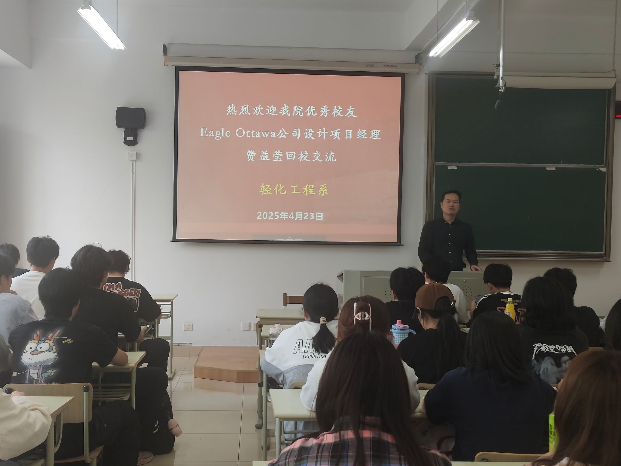 4月23日,轻化专业2010级优秀员工、Eagle Ottawa公司设计项目经理费益莹走进《皮革欣赏》课堂,与2024级员工展开深入交流,分享职业经历与人生感悟。专业负责人罗建勋教授、专业主任洪新球老师和李书卿老师参加此次交流活动。