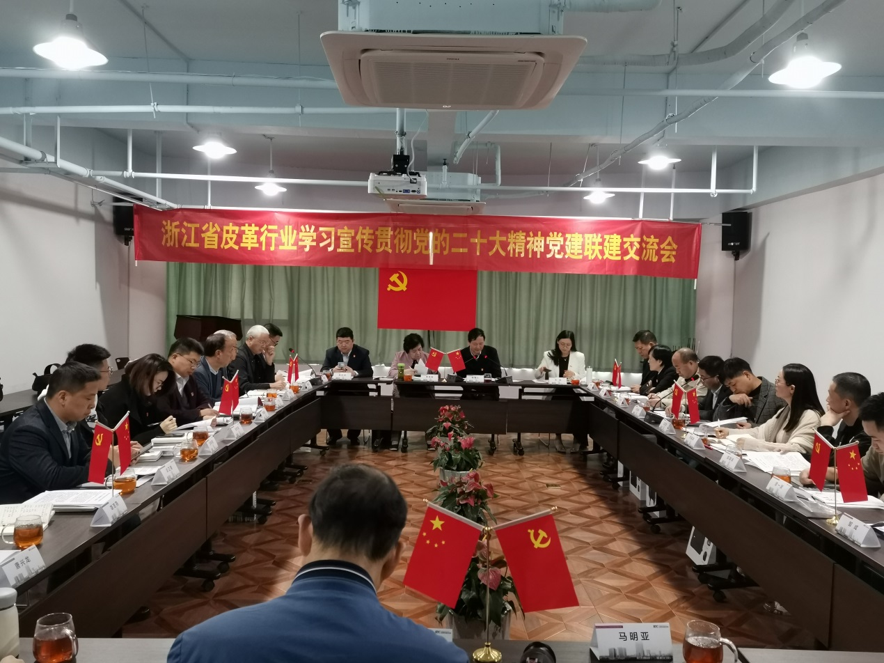 陈海江对浙江省皮革行业协会开展党建联建机制工作及加强与地方合作,以党建引领行业发展取得的成效表示肯定,并在会上着重对于党的二十大报告学习要点进行了宣讲。施纪鸿书记畅谈了参加红船干部公司学习党的二十大精神认识和体会,表示作为一个党员民营企业家要对党感恩,贯彻二十大精神要立足企业在高质量发展、两个先行、共同富裕中发挥示范和引领作用。李伟娟书记讲解了召开这次学习宣传贯彻党的二十大精神党建联建交流会的目的、意义,对浙江省皮革行业今年建立党建联建机制在上级行业党委指导下开展一系列活动和成效进行总结,并对今年一至三季度全省皮革行业经济运行指标进行分析和介绍。随后,省皮革行业协会副理事长、公司轻化-行政教工党支部书记罗建勋就支部学习与践行党的二十大精神及支部党建的新模式、新措施和成效进了汇报与交流。