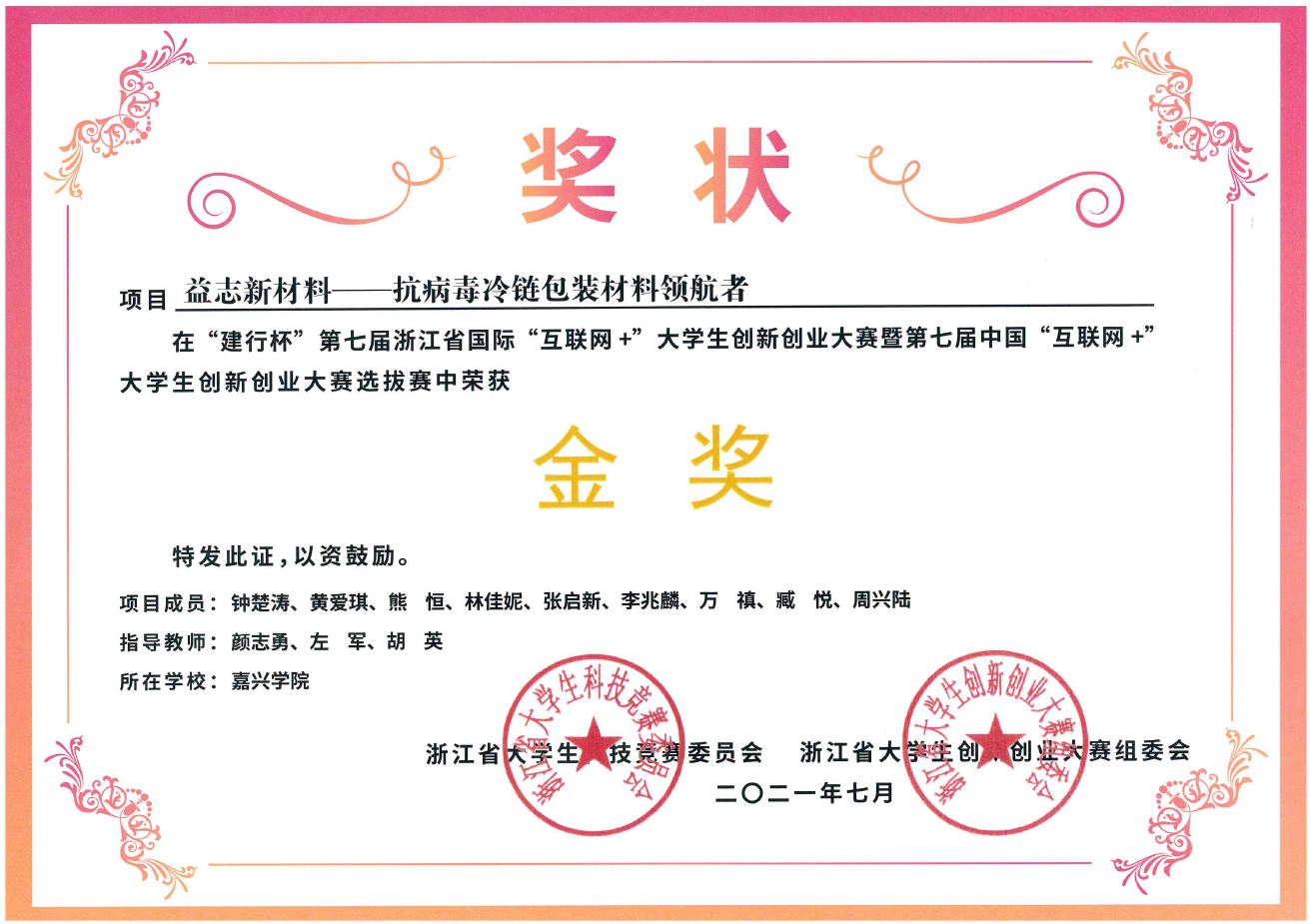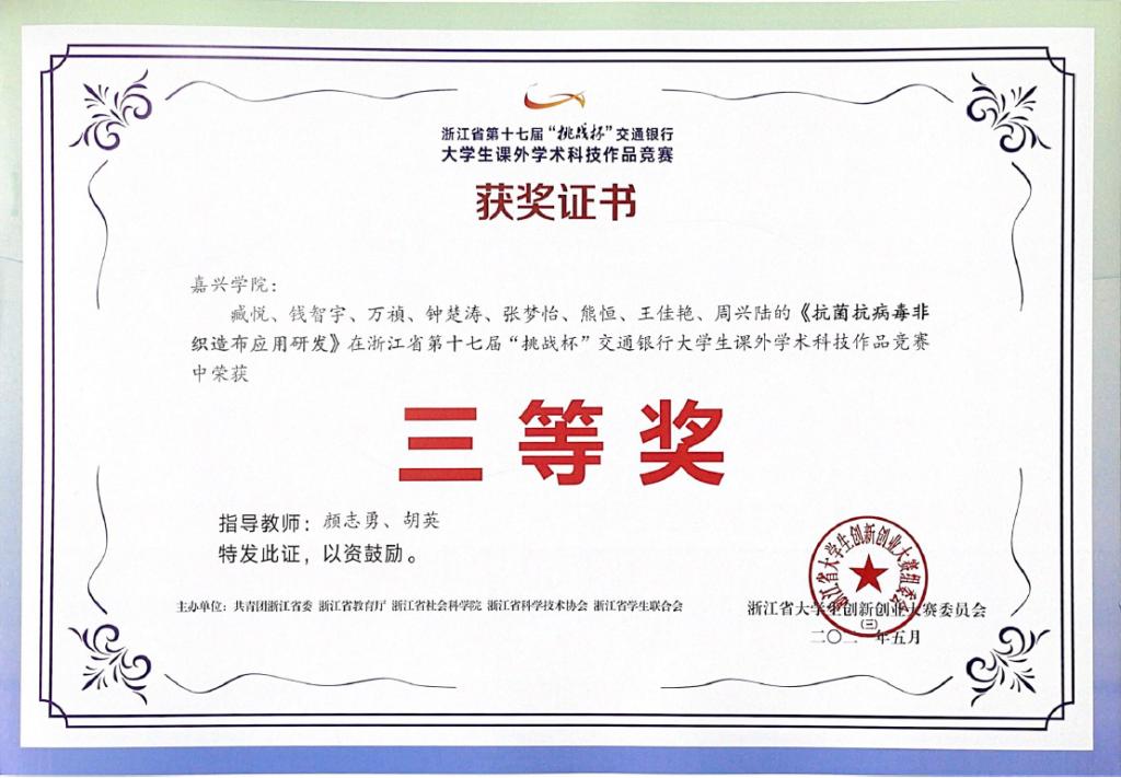 高材教工支部颜志勇教授指导的员工项目获“互联网+”全国老员工创新创业大赛铜奖1项,指导的项目:“益志新材料—抗病毒冷链包装材料领航者”获“建行杯”浙江省国际“互联网+”老员工创新创业大赛暨第七届中国“互联网+”老员工创新创业大赛选拔赛中获省级金奖1项。项目“抗菌抗病毒非织造布应用研发”获挑战杯省级三等奖1项。