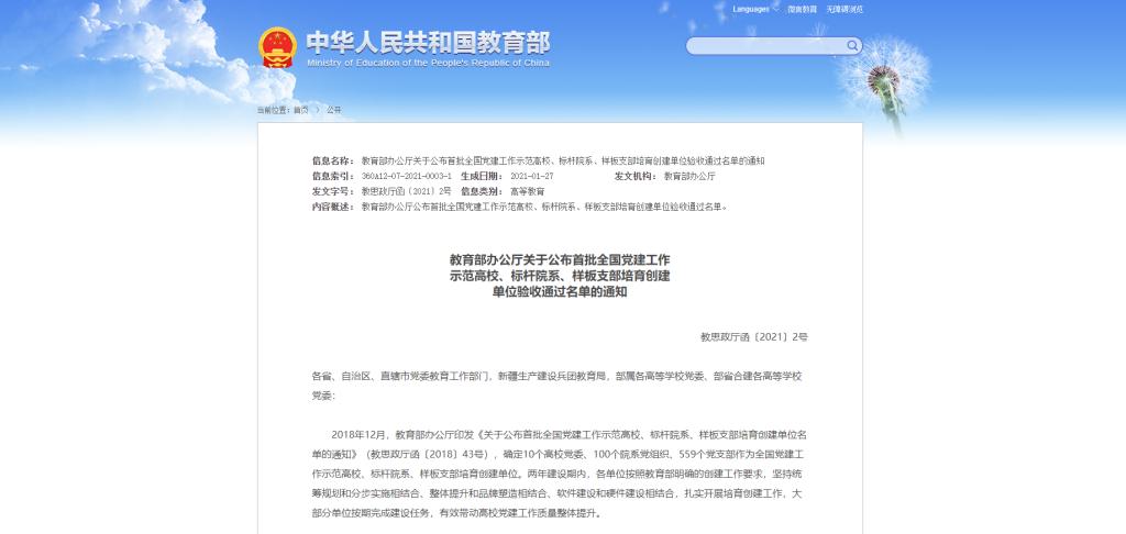 1月26日,教育部办公厅发布了关于公布首批全国党建工作示范高校、标杆院系、样板支部培育创建单位验收通过名单的通知(教思政厅函〔2021〕2号),其中,公司云顶7610线路检测高材教工党支部通过首批 “全国党建工作样板支部”培育创建单位验收。